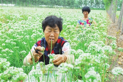 即墨区灵山街道李前庄村的村民在采摘韭菜花。