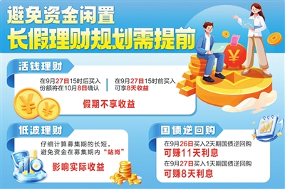 “踩准点布局假期理财,避免因迟购1分钟错过8天假期收益……”记者梳理发现,国庆假期前,9月27日为最后一个理财交易日。根据部分活期理财产品的收益规则,在法定节假日前最后一个开放日申购或转换转入的份额,不享有该日和整个节假日期间的收益。具体来看,在9月27日15时前买入,可享受9月30日至10月7日8天收益;在其之后买入,份额将在10月8日确认,假期不享受收益。因此,为避免资金“站岗”,投资者应提前做好投资计划。