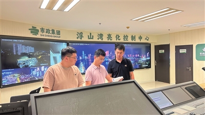 朱龙龙(中)在浮山湾亮化控制中心值班。