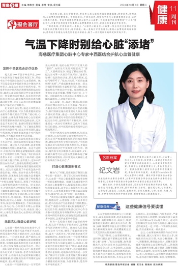 纪文岩1994年医学专业毕业,2005年来到青岛市海慈医疗集团工作,开始专注于中西医结合治疗心血管疾病。她不仅是全国老中医药专家吉中强的学术传承人,也是山东省名中医药专家。凭借多年的中医药知识积累和西医临床经验,她在心血管疾病的诊疗中逐步探索出一种全新的治疗模式,旨在利用中西医结合的方法,既发挥西医的急救与精确诊断优势,又充分运用中医的整体调理与个体化治疗的特点。