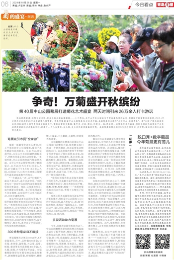 另外,对于今年的菊展,城市公园节还特别增加了数字板块,联合青碳行平台在线上公益发行2024个青岛市第40届中山公园菊展数字藏品。该数字藏品于10月26日9时起上线,市民可登录“青碳行”APP领取,先到先得,领完即止。城市公园节期间,青岛琅琊台集团、青岛新希望琴牌乳业有限公司等在菊展上推出金秋市集,整合美酒、美食、文创产品等进行展示和惠民展销,琅琊台酒展区还有互动抽奖活动。本版撰稿摄影 观海新闻/青岛早报首席记者 孙启孟