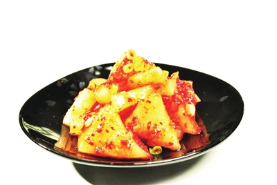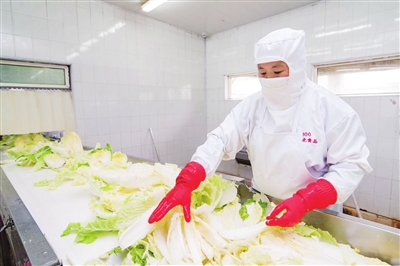 白菜调味前需要经过7道清洗程序,保证食材的洁净,所有的葱、姜、蒜等原辅料都必须进行消毒程序,降低发酵前杂菌及微生物的影响。调味之前所有主菜手工挑选,辣椒粉、糖、盐、味精、醋等辅料全部过筛。“腌制完成后与泡菜酱混合过程中全部进行手工挑选,萝卜一片一片拣出来。”徐悦东告诉记者,泡菜的原材料、半成品、成品的存放及整个生产流程都进行严格的温度管理。严格的温度控制能够减少生产过程中微生物的滋生环节,而特殊的发酵技术更是让产品具有醇香的口味。
