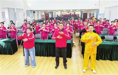 陈淑珍(左)、王俊胜(中)和社区居民一起做拍打养正操。