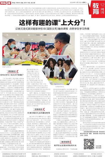 学生喜欢的课堂是什么样?好课让学生开始时满腹狐疑,过程中充满探究的好奇,结束后则是知识冲击心灵的惊喜。近年来,青岛始终致力于探索高效课堂教学模式的变革,用创新与融合实际生活的思路打开新课标,让学生愿意参与其中,跟随老师一起开启学习探索之旅。近日,记者走进超银学校“上新”的IB(国际文凭)融合课程,这一对多数人还比较陌生的名字,其实课程理念与教育一直追求的培养目标异曲同工,“跨界”的老师、“跨学科”的教学,小组合作探究的自主学习管理,让问题提出、解决和知识鲜活起来的课堂……IB融合课程为超银学子们拆“围墙”、开“窗户”,着重培养自主学习能力、创新能力,呈现出超银教育的新生态。