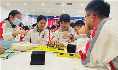 这节化学IB融合课程,不同于以往的老师台上教、学生台下听,而是全程主打层层递进的“探究”,全程由小组合作的学生团队唱“主角”。“哪些特定环境和特殊人群有额外的氧气需求?在特殊需求下对于制氧机有什么要求?”在初中化学老师李柳莹的引导下,同学们在小组内积极思考、讨论、分享,随后大家拿出说明书,对比生活制氧机与实验室制取氧气装置异同,并结合所学化学知识,解释说明书的注意事项:为什么不同季节加的水量不同?使用时如果不加B试剂有什么影响?有了丰富的思考和前期准备,接下来便是同学们亲自动手实验环节,自制简易制氧机。“先倒水看看”“别忘了封堵严密”“有了,有了!”组员们有的操作,有的记录,一边回忆理论知识一边动手实践,表情渐渐也从一丝不苟到喜悦、开心,一台简易制氧机在手中成功诞生。