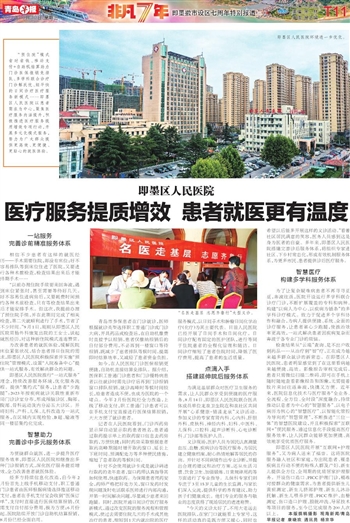 “预住院”模式省时省钱、移动支付+自助机结算助力门诊医保报销免排队、多学科联合诊疗门诊解民忧、短平快的日间诊疗医疗服务新模式……即墨区人民医院以患者需求为中心,聚焦医疗服务内涵提升,积极推进医疗服务提质增效专项行动,开展多元化模式服务,努力为广大群众提供更高效、更便捷、更贴心的就医体验。