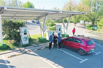 即墨区供电公司员工在莲花田园“光储充放”一体化充电桩为客户讲解充电注意事项,服务群众绿色出行。