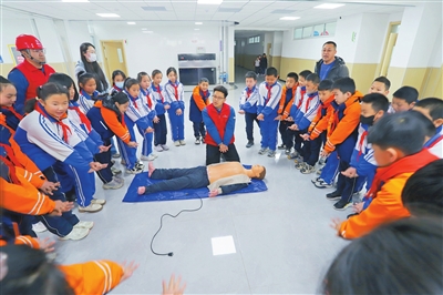 开学第一课,守护电安全。即墨区供电公司彩虹共产党员服务队为学生讲解触电急救知识。