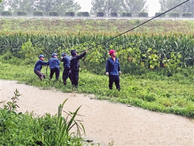 迎峰度夏期间,即墨区供电公司员工雨中抢修受损线路。