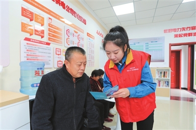 即墨区供电公司网格员在“政电网格融合”示范点为客户讲解办电用电知识。