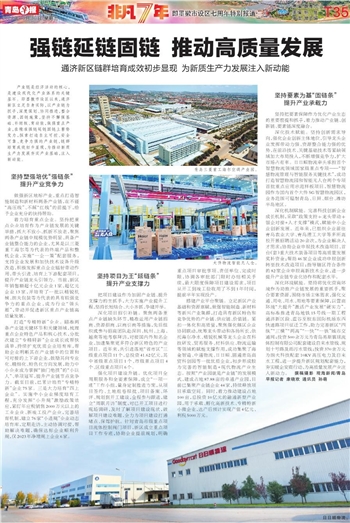 搭建产业平台聚链。立足新区产业基础和资源禀赋,做强智能制造、新材料等新兴产业集群,打造具有新区特色和竞争优势的产业链、供应链、价值链。紧扣一体化和高质量,聚焦强化辖区企业协同联动,统筹龙头带动和各扬所长,依托海尔净水、精锐机械等龙头企业在科技研发、贸易服务、材料供应、物流运输等领域的赋能支撑作用,成功集聚了海金智造、中通物流、日日顺、圆通青岛商贸科创园等一批优质企业,初步形成较为完善的智能制造+现代物流产业生态。按照“产业园就是产业链”的发展模式,建成占地87.88亩的卓通产业园,目前已集聚产业链企业44家,持续释放项目承载空间。同时,着力推动建设占地100亩,总投资10亿元的融通新型产业园,用于承载、孵化高新技术、专精特新小微企业,达产后预计实现产值4亿元、利税5000万元。