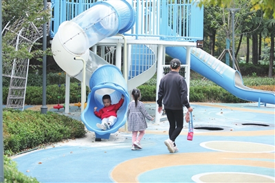一名儿童在深圳路体育公园内玩滑梯。