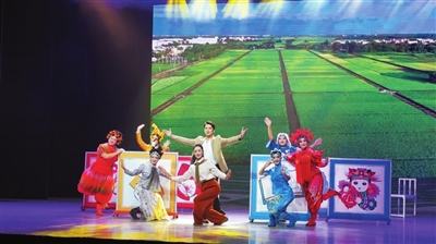 在导演层面,全剧的舞台调动井然有序,且能充分考虑演员走位与演唱的相互关系,实现了剧目呈现的连贯与流畅。在表演层面,王晴和李克城饰演的男女主人公扮相佳、活力足、唱腔婉转悠长,很好地展现了当代有为青年积极向上的人物形象。刘玲(饰演扇子)、赵新丽(饰演书签)、龙玉美(饰演螺钿)、耿涵(饰演水杯)、王艺睿(饰演翻花)、相心程(饰演年画),六位演员惟妙惟肖地展现了创灵形象,唱腔上也具有不俗的功底。更重要的是,这六位创灵人物非常有喜感,切实增强了《小欢喜》的喜庆氛围。