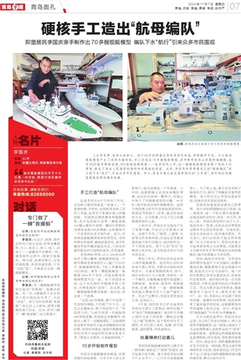 人生而有梦,或伟大或渺小。对于60岁的即墨区居民李国庆来说,梦想触手可及。从小就对舰艇模型产生了浓厚兴趣的他,手工打造出70多艘舰艇模型,其中既有航母山东舰和福建舰,也有052D型导弹驱逐舰、055型驱逐舰模型……在李国庆心中,这一艘艘舰艇模型承载了他的儿时梦想,表达了他对人民海军的情怀和对舰艇的热爱。近来,李国庆时常带着自己的“舰艇编队”到公园下水“航行”,引来众多市民围观。昨日,青岛早报记者走进李国庆的“工作室”,聆听他打造微型舰艇世界的精彩故事。