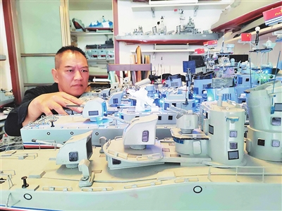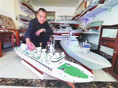 “这是021导弹艇,属于中国第一代自制导弹艇,大约做了半个月。这是山东舰航母,做了将近两个月。”李国庆介绍,“从新中国第一代舰艇到055型驱逐舰,再到航空母舰模型,我基本上做了一支舰艇部队。”这些模型诉说着中国海军从起步到崛起的壮丽征程,李国庆笑着说,他制作舰艇模型的经历和中国海军的发展历程差不多,“都是从无到有,从基础到高级。”