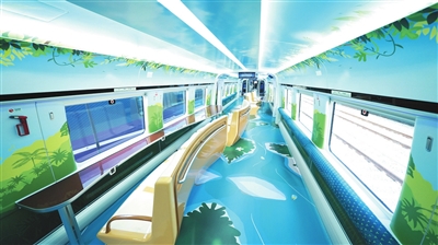 据中车青岛四方股份公司主任设计师鲍腾飞介绍,三乐旅游铁路列车基于我国先进的CINOVA2.0城际市域智能列车平台,融合三乐旅游铁路公交化、旅游化运营需求量身打造。列车由3节特色车厢和1节主题车厢组成,外观、内饰均结合三亚特色,创意十足。