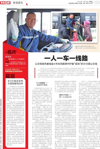 818路公交线位于西海岸新区,2018年5月22日开通,单程7.3公里,共设有12个站点,主要服务西海岸新区的刘家庄、韩家台、大南庄等8个较为偏远的社区。与其他线路不同,青岛真情巴士818路全线仅配备一辆公交车、一名公交驾驶员。近日,记者坐上818路公交车,听驾驶员姜瑞垒讲述自己和这条青岛最“孤独”公交线路的故事。