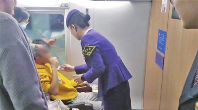情况危急,王艺凡一边迅速启动应急预案,一边通知乘务员通过广播寻找医生,为发病旅客争取宝贵的救治时间。“各位旅客,请注意,现在广播寻医。1号车厢有旅客突发疾病,请问哪位是医护工作者……”与此同时,王艺凡携带药箱迅速来到事发车厢,只见4排座位上的张先生双手紧紧捂住胸口,大口喘息,额头上满是虚汗。