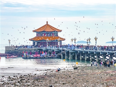 ▲众多市民和游客享受赏鸥乐趣。观海新闻/青报全媒体记者 王雷 摄