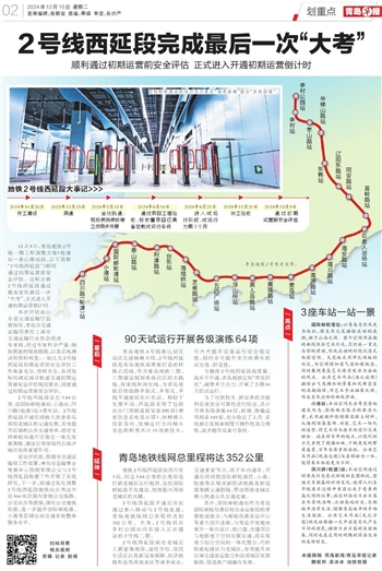 12月9日,青岛地铁2号线一期工程调整方案(轮渡站—泰山路站段,以下简称“2号线西延段”)顺利通过初期运营前安全评估。这标志着2号线西延段通过载客前的最后一次“大考”,正式进入开通初期运营倒计时。