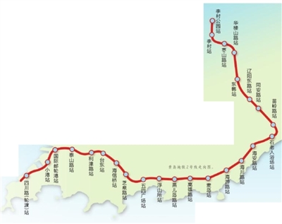 青岛地铁2号线走向图。