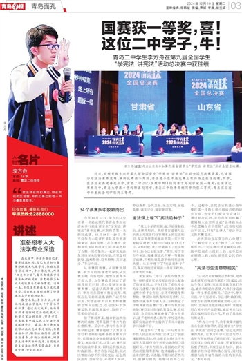 除了赛前准备,能拿到这次比赛的好成绩,更多是源于李方舟的日常积累。采访中,李方舟告诉青岛早报记者,赛前他除了认真学习学校和老师给他准备的竞赛知识外,日常他还会细致研读现行宪法条文、宪法修正案,以及与比赛内容相关的法律条文,同时还积极关注时政新闻。李方舟告诉记者,此次比赛的内容不仅仅是宪法,还包括民法典、国家安全、未成年人保护、劳动教育、公共卫生、生态文明、家庭美德、诚实守信、规则意识等。