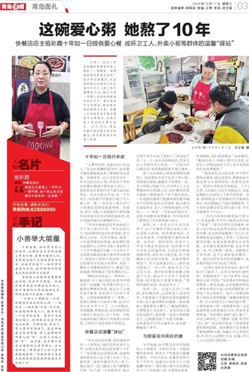 “哪怕仅仅是递上一杯热水、一碗热粥,至少能让他们在寒风中感受到一丝温暖。”祖彩霞为环卫工人提供免费粥的初衷,就是为了让他们有个板凳、有张桌子可以坐下来吃。记者给她粗略算了一笔账,一份爱心粥按1元成本计算,近10年来也有10多万元了。小小快餐店,利润微薄,即便如此,祖彩霞始终坚守着内心的信念,用十年如一日的点滴善举践行着自己传递爱心的承诺,只因自己也曾被别人帮助过。