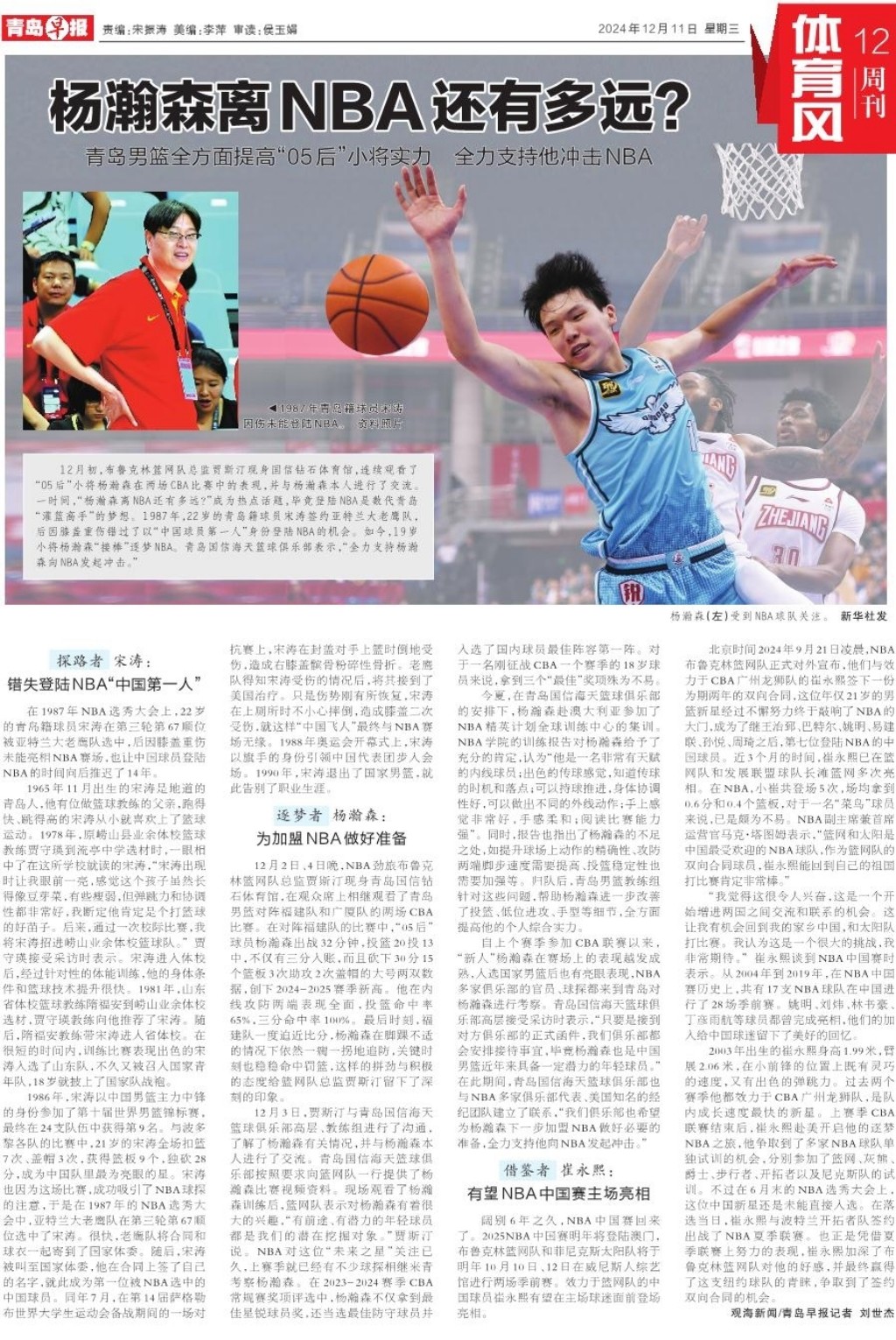 12月初,布鲁克林篮网队总监贾斯汀现身国信钻石体育馆,连续观看了“05后”小将杨瀚森在两场CBA比赛中的表现,并与杨瀚森本人进行了交流。一时间,“杨瀚森离NBA还有多远?”成为热点话题,毕竟登陆NBA是数代青岛“灌篮高手”的梦想。1987年,22岁的青岛籍球员宋涛签约亚特兰大老鹰队,后因膝盖重伤错过了以“中国球员第一人”身份登陆NBA的机会。如今,19岁小将杨瀚森“接棒”逐梦NBA。青岛国信海天篮球俱乐部表示,“全力支持杨瀚森向NBA发起冲击。”