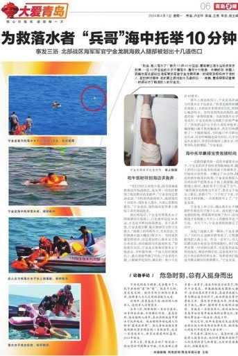 2024年6月13日6时许,卞秀芹在西海岸新区城市阳台游完泳,正准备回家时听到有人呼救,只见离岸200多米处,有位老人在海面起伏。她立即脱下衣服快速冲进怒涛中,费尽力气一边托着落水者一边往岸边游。最终在岸边热心市民帮助下,将落水者救上岸。待110赶到后,见落水者并无生命危险,卞秀芹才放心离开。