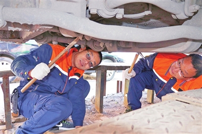 走进李沧巴士公司百通馨苑停车场,在场站东南角方向一个简陋的维修地沟旁,几辆公交车正整齐排列等待检修。地沟附近,多位修理工紧张忙碌着,他们弯着腰、歪着头,手里拿着扳手正在对车辆底盘的零部件进行检修,他们就是李沧巴士第一分公司“三原色”维修班。记者了解到,“三原色”维修班共有6人,成员平均年龄40岁,其中接触公交车维修工作时间最长的30年,最短的也有6年,用他们自己的话说,“经手的车辆数不清”。