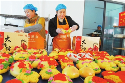 即墨区龙泉街道汪河水北村村民将做好的花馍装箱销售。