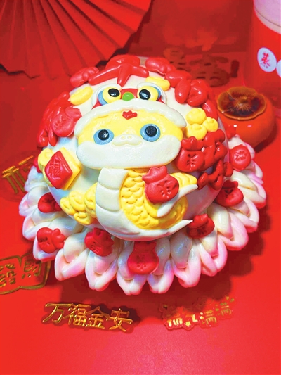 连日来,“巧姑娘”花饽饽非遗传承人周淑英每天一大早便忙碌起来。只见她把面团搓圆搓长后,用果蔬汁调制颜色,用3D打印的模具在面团上刻出“萌蛇”的五官,再给它披上“醒狮帽”,周围点缀上“福袋”“元宝”等喜庆元素,一个可爱的“萌蛇”花饽饽就做好了。“我们推出的蛇年新款花饽饽,造型卡通、颜色鲜艳,蛇身金黄色,头戴红色的‘醒狮帽’,祝愿人们新年红红火火,周围还点缀着喜庆元素,寓意八方来财、万福金安。这些花饽饽既有观赏性,又是健康食品,自推出以来,广受欢迎。”周淑英说。