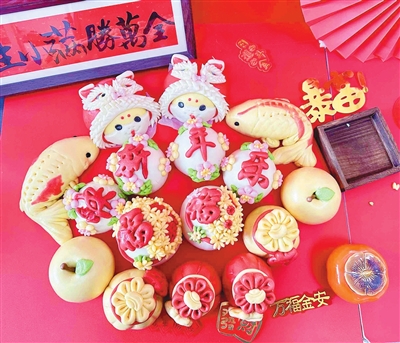 在即墨区龙泉街道汪河水北村,随着春节的脚步临近,空气中弥漫着浓浓的年味。1月16日,记者刚踏入薛增玉的花馍加工点,香气便扑面而来,刚出笼的五彩斑斓、造型各异的花馍令人目不暇接。“今天一上午,我就接到周边村庄顾客打来的10多个电话,既有预订孩子百岁花样馒头的,也有马上要来店里买‘鱼花’馒头的。进了腊月门,每天都忙到晚上10点,依旧供不应求。”薛增玉笑容满面地说。