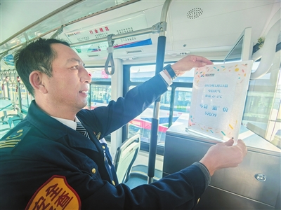 209路驾驶员迟野磊在车厢内张贴信息牌。