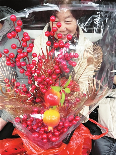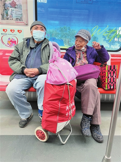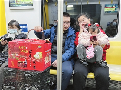 大红的袋子让地铁车厢年味满满。