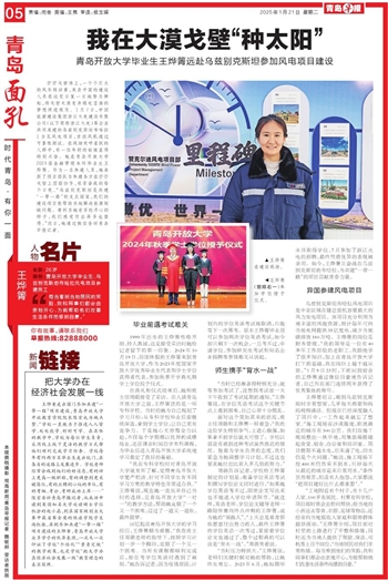 乌兹别克斯坦布哈拉风电项目是中亚区域在建总装机容量最大的风力发电项目。该项目充分利用当地丰富的风能资源,预计每年可向当地电网提供35亿度电,减少当地碳排放160万吨。王烨箐的岗位是财务管理。“我的领导是一位有40多年工作经验的老职工,我跟他学了很多知识,加上在青岛开放大学打下的基础,我在岗位上越干越从容。”1月9日23时,下班回到宿舍的王烨箐通过微信自豪地告诉记者,自己所在部门连续两年获得了优秀集体的称号。