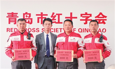向参加西藏日喀则地震救援的青岛红十字搜救队3名队员发放救援奖励金。