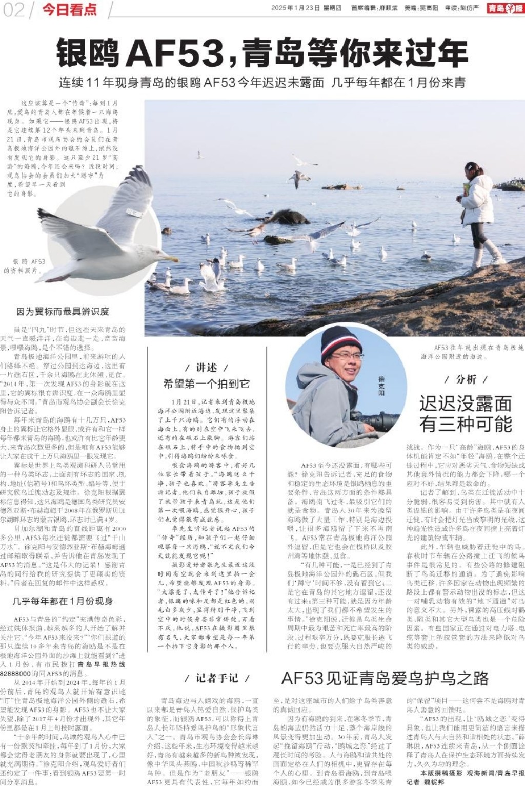这应该算是一个“传奇”:每到1月底,爱鸟的青岛人都在等候着一只海鸥现身。如果它——银鸥AF53出现,将是它连续第12个年头来到青岛。1月21日,青岛市观鸟协会的会员们在青岛极地海洋公园外的礁石滩上,依然没有发现它的身影。这只至少21岁“高龄”的海鸥,今年还会来吗?近段时间,观鸟协会的会员们加大“蹲守”力度,希望早一天看到它的身影。