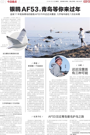 AF53至今还没露面,有哪些可能?徐克阳告诉记者,充足的食物和稳定的生态环境是银鸥栖息的重要条件,青岛这两方面的条件都具备。海鸥南飞过冬,最吸引它们的就是食物。青岛人30年来为挽留海鸥做了大量工作,特别是海边投喂,让很多海鸥留了下来不再南飞。AF53常在青岛极地海洋公园外逗留,但是它也会在栈桥以及胶州湾等地休憩、觅食。