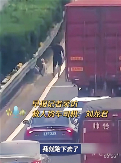 货车司机刘龙君恰好驾车路过,“大货车比普通轿车高很多,我在驾驶室里远远就看到这位老人坐在地上一点点移动,当天天气非常炎热,高速上的车流量很大,车速也很快。”刘龙君回忆称,他见状立即打开双闪,将车停在离老人不远的地方,希望以此拦停后方车流。“之后我赶紧跳下车跑过去查看老人情况。”刘龙君不断地安抚老人,确保他的安全。