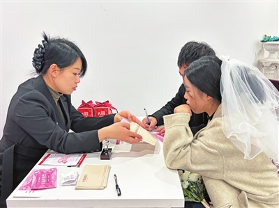 完成集章打卡的新人可以领取一本“爱情存折”,以后的每年周年纪念日可以凭借着存折回婚姻登记处领取新的存折,以此打卡纪念,作为新人爱情的见证。