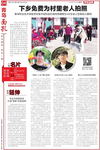 “社会上很多老人需要我们的关爱,给他们拍完照后感触很多……”昨日,青岛早报发布的“青岛在读大学生寒假返乡免费为老人拍照”视频,引发了众多网友关注和点赞。故事中的两位大学生是来自青岛职业技术学院的大二学生杨丰菘和张纪瑞,20岁的他们提前谋划、多次沟通,利用寒假时间走进偏远乡村,以“天安门广场”为背景,为一群八九十岁的爷爷奶奶精心拍下影像记忆。