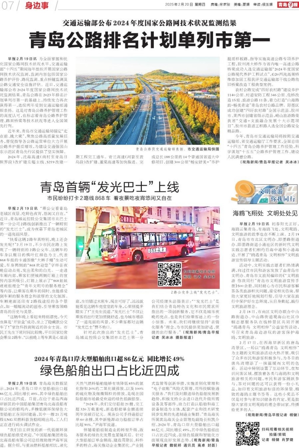 “快看这辆2路车真特别,晚上还会发光呢!”2月19日,不少市民在路上发现了一辆特别的2路公交车,这辆车的车身以醒目的枫叶红颜色为主,代表868车组的卡通图像“大辫子嫚”生动可爱,车身两侧的“868欢迎您”字样在夜晚自动点亮,发出柔和的白光。一走进车厢内部,乘客们便被两侧灯箱上的宣传内容所吸引,灯箱上展示了“868姐妹班班组理念”“青年文明号的服务理念”等内容,让乘客在乘车的同时,也能感受到车厢的服务理念和浓厚的文化氛围。车厢地面还印有2路线途经的各个景点,如一幅幅流动的画卷,引导乘客领略青岛的历史与美景。
