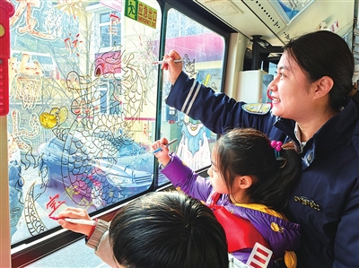 走进36路主题车厢,仿佛进入了一个充满童趣和传统习俗的“文化长廊”。车窗上绘满了色彩鲜艳的卡通“龙”形象,其中最引人注目的是学生们创作的《给龙理发》手绘画。画中,一个个憨态可掬的卡通形象手持剪刀,正在为一条威风凛凛的龙修剪毛发。画面生动有趣,寓意“龙抬头”理发去旧迎新的传统习俗。整个车厢洋溢着浓厚的节日氛围,乘客们一上车便被这独特的布置所吸引,纷纷拿出手机拍照留念。一位乘客感慨道:“没想到坐公交车还能感受到这么浓厚的节日气氛,真是既惊喜又暖心!”