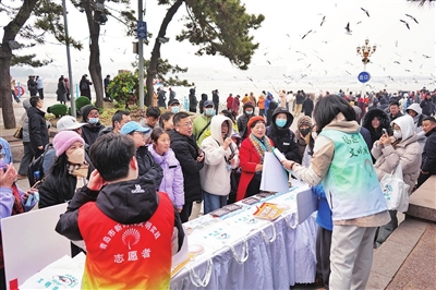 早报2月27日讯 一年春好处,相约文明行。为倡树文明新风,展示青岛文明有礼、热情包容的城市形象,2月27日,青岛市“鸥遇青岛 文明相伴”主题系列活动之“相约美好春天行”文明旅游宣传活动在青岛市新时代文明实践体验展示区举行。活动由青岛市文明办主办,市南区新时代文明实践中心、市南区文明办、青岛市海滨风景区管理服务中心、市南区历史城区保护发展局、市南区历史街区建设运营中心、青岛海明城市发展有限公司承办。活动将文明旅游、文明观鸥宣传与春天氛围巧妙结合,在栈桥风景区、文明旅游驿站同步开展文明互动体验游戏、文明旅拍服务、关爱海鸥主题科普宣传等,引导市民游客践行文明旅游理念,营造和谐有礼旅游环境。