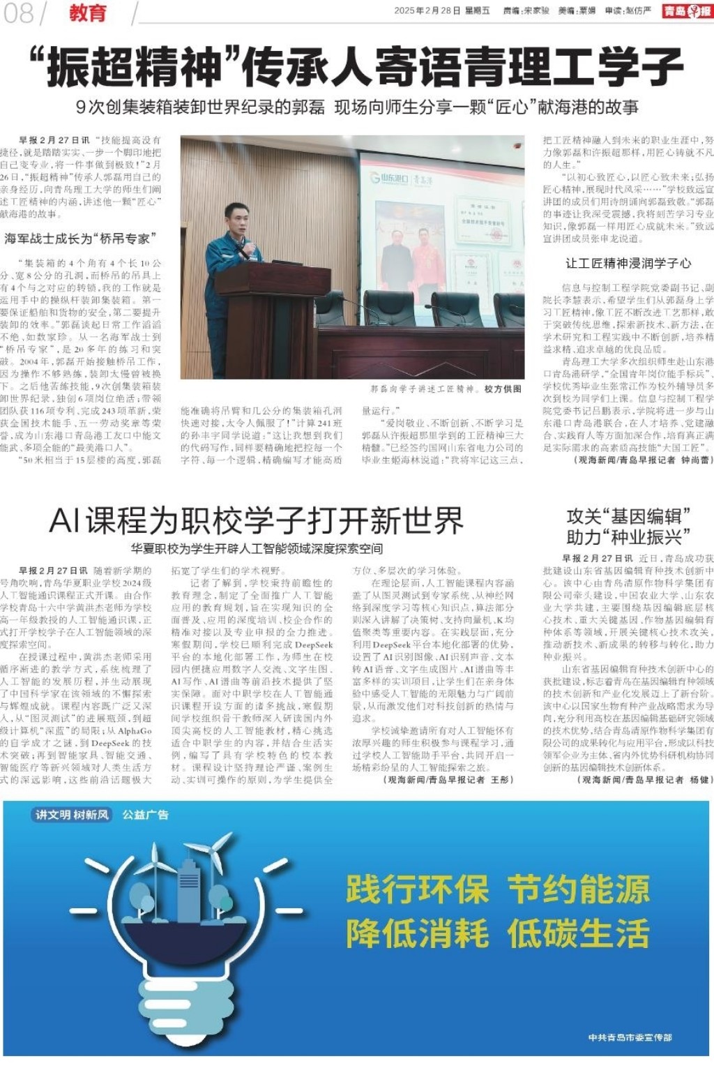 早报2月27日讯 “技能提高没有捷径,就是踏踏实实、一步一个脚印地把自己变专业,将一件事做到极致!”2月26日,“振超精神”传承人郭磊用自己的亲身经历,向青岛理工大学的师生们阐述工匠精神的内涵,讲述他一颗“匠心”献海港的故事。