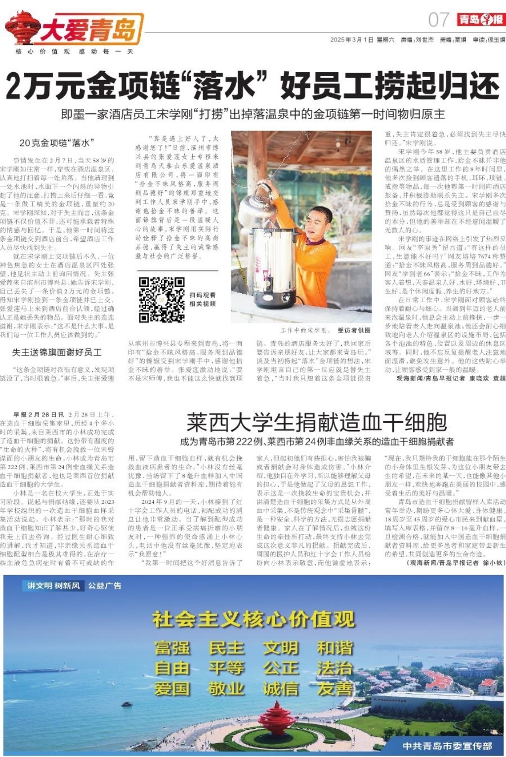 “真是遇上好人了,太感谢您了!”日前,滨州市博兴县的张爱莲女士专程来到青岛天泰山乐爱温泉酒店有限公司,将一面印有“拾金不昧风格高,服务周到品德好”的锦旗郑重地交到工作人员宋学刚手中,感谢他拾金不昧的善举。这面锦旗背后是一段温暖人心的故事,宋学刚用实际行动诠释了拾金不昧的高尚品德,赢得了失主的诚挚感激与社会的广泛赞誉。