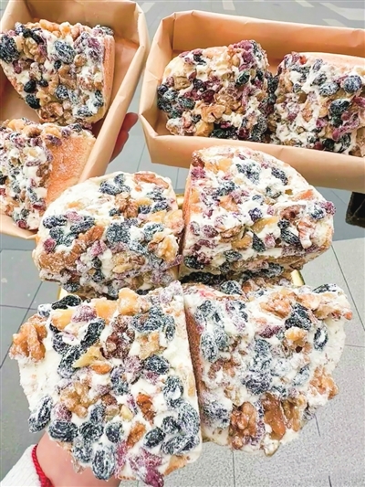 制作“新疆奶酪包”,要用到奶酪和牛奶,使其完美呈现奶香浓郁的特点,绝对是下午茶必备。奶酪包制作时,浑圆的麦香面包被均匀切成四块,接着在面包的切面抹上厚厚的奶酪,裹上密密的一层葡萄干、蔓越莓干、核桃仁,最后撒上一层奶粉。面包的麦香、绵密的奶香、干果的果香和坚果的脆香碰撞、交融,最终形成让人欲罢不能的甜香。冷冻后的“新疆奶酪包”吃起来别有一番乐趣——冰凉丝滑的奶酪入口便如冰淇淋一般在舌面温柔化开,坚果冻后反而更脆,配合软韧的麦香面包,再来杯热咖啡就是工作间里的甜蜜下午茶。