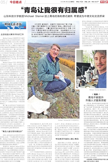 青岛的建筑艺术、海洋文明、民俗风情、历史名人文化等,构建出多元文化体验空间,吸引着Michael Steiner的兴趣和关注。当然,青岛啤酒和海鲜也是他的最爱。Michael Steiner的中文其实并不够流利,他说,“青岛人都非常热情友好,即使我中文说得不好,他们总是耐心地与我交流,这种包容性让我很快适应了这里的生活。”国际间的交流合作实质上是人与人之间的交流合作,在中国的外籍人才多到中国的城市走一走看一看,亲身感受中国的魅力,也能更好地成为讲述中国故事的使者和促进中国与其他国家人民沟通交流的桥梁和纽带。