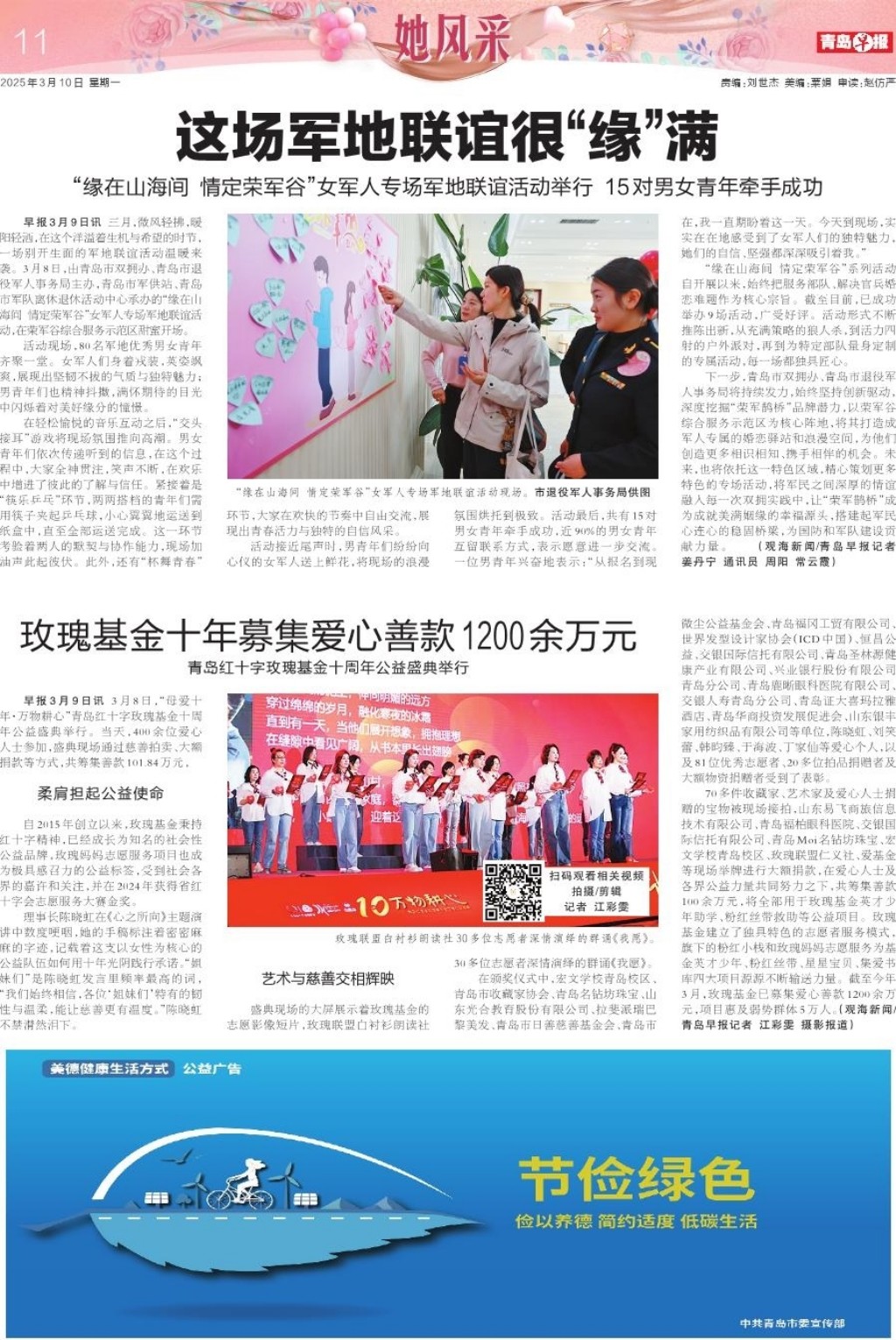 下一步,青岛市双拥办、青岛市退役军人事务局将持续发力,始终坚持创新驱动,深度挖掘“荣军鹊桥”品牌潜力,以荣军谷综合服务示范区为核心阵地,将其打造成军人专属的婚恋驿站和浪漫空间,为他们创造更多相识相知、携手相伴的机会。未来,也将依托这一特色区域,精心策划更多特色的专场活动,将军民之间深厚的情谊融入每一次双拥实践中,让“荣军鹊桥”成为成就美满姻缘的幸福源头,搭建起军民心连心的稳固桥梁,为国防和军队建设贡献力量。 (观海新闻/青岛早报记者 姜丹宁 通讯员 周阳 常云霞)